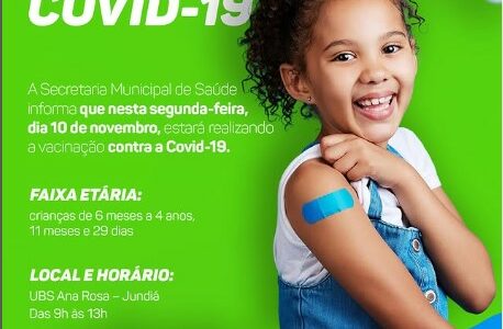 Atenção, pais e responsáveis: nesta segunda-feira, 10 de novembro, a Secretaria Municipal de Saúde estará realizando a vacinação contra a Covid-19 para crianças de 6 meses a 4 anos, 11 meses e 29 dias.