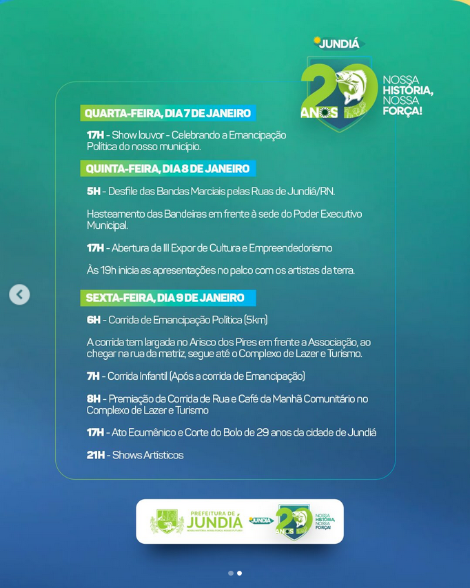 - 17h: Atual Excomunhão(?) e Corte do Bolo de 29 anos da cidade de Jundiá. (Nota: o termo “Excomunhão” parece ser um erro de digitação; provavelmente seria algo como “Comemoração” ou “Solenidade”.)
