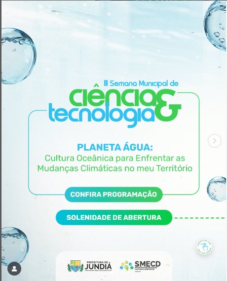 A nossa III Semana Municipal de Ciência e Tecnologia tem como tema “PLANETA ÁGUA: Cultura Oceânica para Enfrentar as Mudanças Climáticas no meu Território”