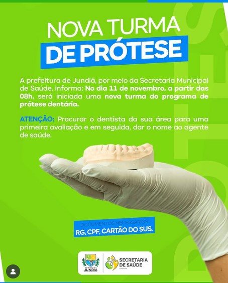 A Prefeitura de Jundiá, por meio da Secretaria Municipal de Saúde, informa que no dia 11 de novembro, a partir das 08h, será iniciada uma nova turma do programa de prótese dentária. Acontecerá na UBS Arisco dos Pires.