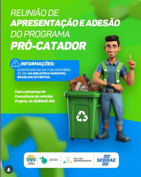 A Sala do Empreendedor de Jundiá, em parceria com o SEBRAE-RN, realiza no dia 11 de novembro, às 10h, na Biblioteca Municipal Brasilina de Freitas, a reunião de apresentação e adesão ao Programa Pró-Catador.