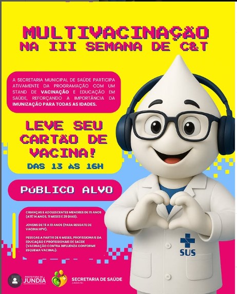 A Secretaria Municipal de Saúde participa ativamente da programação com um stand de vacinação e educação em saúde, reforçando a importância da imunização para todas as idades.